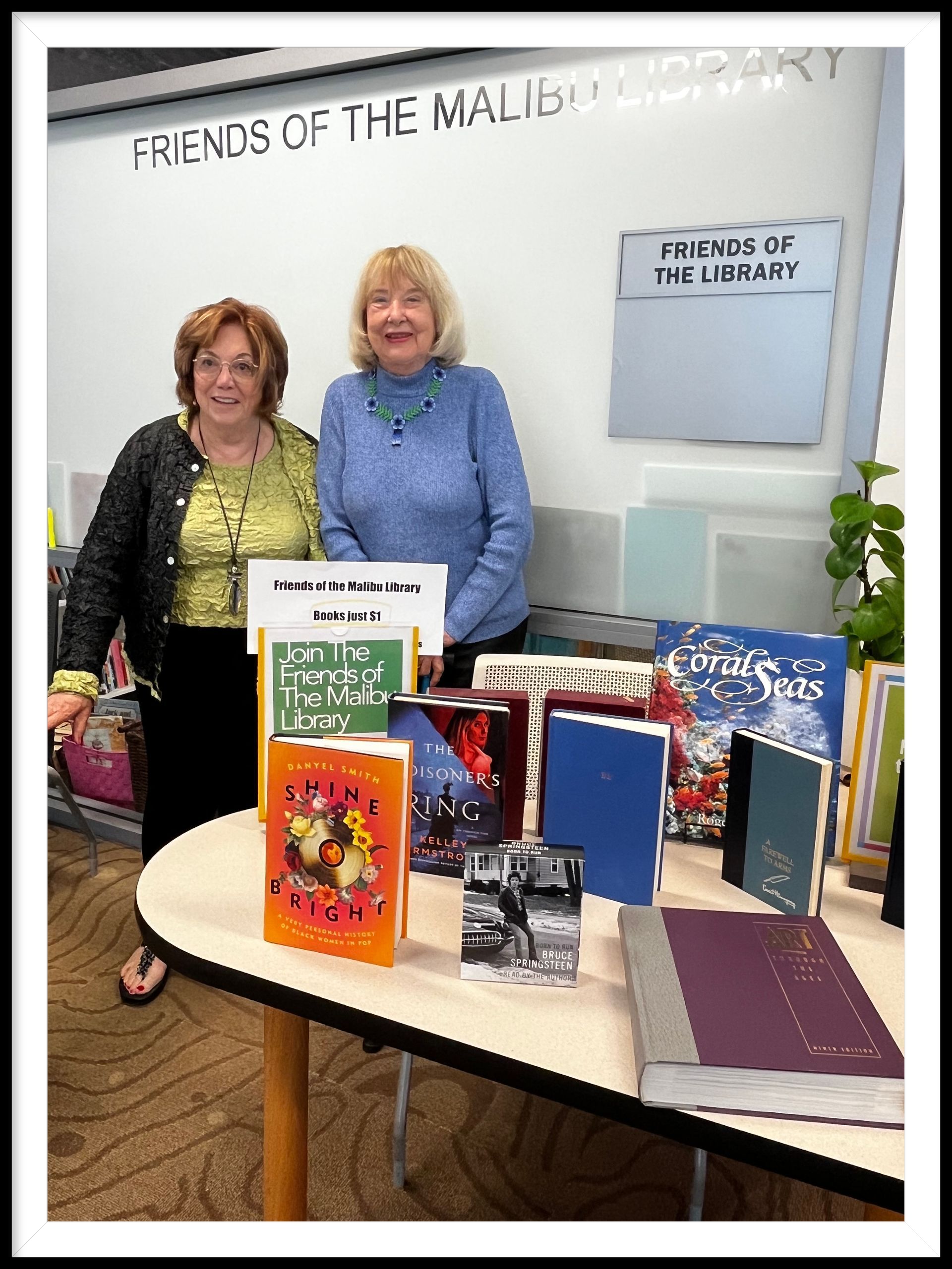 After years of volunteer service as FOML bookstore manager, Harriet Pollon (left) transitioned the position to Caroline Maclay (right) at the annual meeting on Saturday, March 22, 2025.